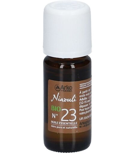 Complément alimentaire à utiliser dans le cadre d’une alimentation variée, équilibrée et d’un mode de vie sain.L'huile essentielle de niaouli Arkopharma est une huile 100% pure et naturelle recommandée pour son action antivirale puissante et immunostimulante permettant de renforcer les défenses immunitaires de l'organisme. Elle possède aussi des propriétés mucolytiques et décongestionnantes efficaces en cas d'encombrement des voies respiratoires et ses propriétés décongestionnantes permettent aussi de lutter contre les sensations de jambes lourdes en favorisant la circulation sanguine.BénéficesOrigine géographique certifiée selon des critères rigoureux : zone géographique, climat, conditions de culture et de récolte.Choix du meilleur procédé de distillation, à la vapeur d’eau ou par expression à froid.Huiles Essentielles Botaniquement et Biochimiquement Définies (HEBBD), 100 % pures et naturelles, non dénaturées, non coupées, non diluées, non reconstituées.Certification biologique accordée par ECOCERT.Contrôle de l’identité et de la qualité de chacune des huiles essentielles.Ingrédients100% Huile essentielle de feuille de Niaouli bio (Melaleuca viridiflora), Myrtaceae. Origine Madagascar.Valeurs nutritionnelles Pour 4 gouttesPour 6 gouttesHuile essentielle de Niaouli121 mg181 mg dont cinéole-1,857 mg85 mg viridiflorol5 mg7 mgConseils d'utilisationNe pas utiliser pure par voie orale mais sur un support neutre (sucre, miel, comprimé neutre...). Pour les adolescents de 12 à 15 ans, prendre 2 gouttes 2 fois par jour. Pour les adultes, prendre 2 jour 3 fois par jour.Précautions d'emploiNe pas utiliser chez les femmes enceintes, allaitantes, les personnes ayant des antécédents de convulsion ou épileptiques, les personnes asthmatiques ou allergiques aux huiles essentielles.Tenir hors de portée des enfants.Éviter tout contact avec les yeux. En cas de contact accidentel, apaiser avec une huile végétale grasse, rincer longuement à l’eau froide et consulter un médecin.Un complément alimentaire ne doit pas se substituer à une alimentation variée et équilibrée et à un mode de vie sain.Poids net10 mlAdresse du FabricantArkopharmaBP 2806511 CARROS Cedex ...