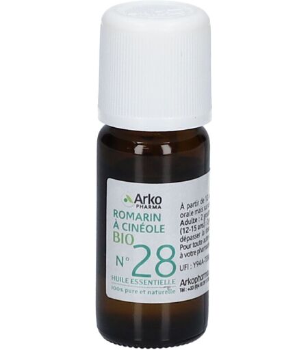 Complément alimentaire à utiliser dans le cadre d'une alimentation variée, équilibrée et d'un mode de vie sain.Huile Essentielle 100 % pure et naturelle.L’huile essentielle de Romarin BIO, extraite des sommités fleuries, provient du Maroc. Son odeur est fraîche, aromatique, puissante, aux notes quelque peu camphrées.Ingrédients100 % Huile essentielle de sommité fleurie de Romarin à cinéole BIO (Rosmarinus officinalis), Lamiaceae, origine Maroc.Données nutritionnelles Pour 4 gouttesPour 6 gouttesHuile essentielle de Romarin à cinéole121 mg182 mg dont cinéole-1,851 mg77 mg α-pinène12 mg19 mg camphre9 mg14 mgConseils d'utilisationsÀ partir de 12 ans.Ne pas utiliser pure par voie orale mais sur un support neutre (sucre, miel …).Adulte : 2 gouttes, 3 fois par jour.Adolescent (12-15 ans) : 2 gouttes, 2 fois par jour.Ne pas dépasser la dose journalière recommandée. Pour toute autre utilisation, demandez conseil à votre pharmacien.Précautions d'emploiNe pas utiliser chez les femmes enceintes, allaitantes, les personnes ayant des antécédents de convulsion ou épileptiques, les personnes asthmatiques ou allergiques aux huiles essentielles.Tenir hors de portée des enfants.Éviter tout contact avec les yeux. En cas de contact accidentel, apaiser avec une huile végétale grasse, rincer longuement à l’eau froide et consulter un médecin.Un complément alimentaire ne doit pas se substituer à une alimentation variée et équilibrée et à un mode de vie sain.Poids net10 mlFabricantArkopharmaBP 2806511 CARROS Cedex ...