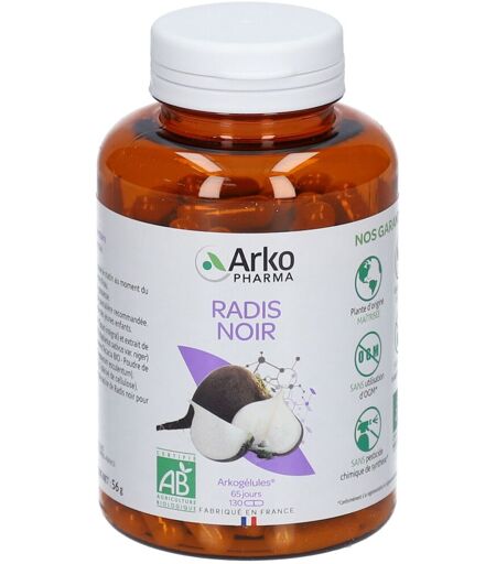 Complément alimentaire à utiliser dans le cadre d’une alimentation variée, équilibrée et d’un mode de vie sain.Arkogélules® BIO Radis Noir, une formule d’origine biologique hautement concentrée en actifs ciblésLe Radis noir est une racine épaisse et comestible qui possède une saveur caractéristique.BénéficesAide à la digestionIngrédientsPoudre (Totum intégral) et extrait de racine de Radis noir* BIO (Raphanus sativus)Agent de charge : gomme d’Acacia BIOPoudre de fruit de Sarrasin BIO (Fagopyrum esculentum)GÉLULE 100% VÉGÉTALE (dérivé de cellulose).Données nutritionnelles Pour 2 gélulesPoudre de racine de Radis noir410 mgExtrait de racine de Radis noir200 mgConseils d'utilisationsVoie orale. À partir de 6 ans.Prendre 2 gélules en une seule prise le matin avec un grand verre d’eau.Précautions d'emploiDéconseillé aux femmes enceintes.Un complément alimentaire ne doit pas se substituer à une alimentation variée et équilibrée et à un mode de vie sain.Ne pas dépasser la dose journalière recommandée.Ne pas laisser à la portée des jeunes enfants.À conserver à l'abri de la lumière, de la chaleur et de l'humidité.Poids net130 gélulesFabricantArkopharmaBP 2806511 CARROS Cedex ...