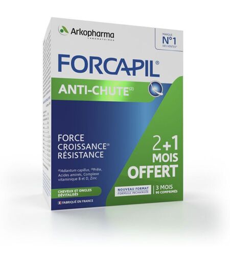 Complément alimentaire à utiliser dans le cadre d’une alimentation variée, équilibrée et d’un mode de vie sain.Forcapil® Anti-Chute, une triple action : pousse, croissance, résistance Forcapil® Anti-chute a été spécialement conçu pour prévenir la chute des cheveux – conséquence directe du stress, de la fatigue passagère, des bouleversements hormonaux, des changements de saison et diverses agressions extérieures – et retrouver pousse, croissance et résistance.Les scientifiques ont développé une formule innovante grâce à son complexe d’acides aminés associé au Cheveu de Vénus.Cette nouvelle formule a été développée pour répondre à vos besoins : elle favorise la pousse, la croissance et la résistance des cheveux. Elle contient des acides aminés soufrés comme la cystine et la méthionine qui font partie des constituants principaux des tissus kératinisés, ainsi que de l’arginine.Elle contient également des vitamines, des minéraux et des extraits de plantes rigoureusement sélectionnés par les experts des laboratoires Arkopharma :La capillaire de Montpellier, ou Cheveu de Vénus (Adantium capillus-veneris) contribue à ralentir la chute des cheveuxLa Prêle favorise la croissance et la résistance des cheveuxLa vitamine B8 et le zinc contribuent au maintien de cheveux en bonne santéLa vitamine B9 contribue à la synthèse normale des acides aminésLa vitamine B6 contribue à la synthèse normale de la cystéine et à la régulation de l’activité hormonaleLa vitamine D3 participe au processus de division cellulaireEnfin, le cuivre participe à la pigmentation normale du cheveuForcapil© Anti-chute est conseillé au féminin comme au masculin, en cas de stress ou de fatigue et aussi en période de ménopause ou post-grossesse.Composition:L-cystine – Extrait de partie aérienne de Cheveux de Vénus (Adiantum Capilllus – Veneris L.) – L-méthionine – Agent de charge : cellulose - Poudre de partie aérienne de Prêle (Equisetum Arvense L.) – Amidon modifié de pomme de terre - Antiagglomérant : mono- et diglycérides d’acide gras et acide stéarique - Oxyde de zinc - Vitamine B5 - Vitamine B6 – L- arginine - Vitamine D3 – Carbonate de cuivre - Vitamine B8 - Vitamine B9.Agents d’enrobage : hydroxypropylméthylcellulose, cellulose, acide stéarique, hydroxypropylcellulose – Agent de charge : carbonate de calcium – Colorant : caramel ordinaire – Concentrés de pomme (Malus domestica Borkh.), cassis (Ribes nigrum L.) et radis (Raphanus sativus L.).Valeur nutritionnelle: Pour 1 comprimé*AJRExtrait de Cheveux de Vénus 150 mg Poudre de partie aérienne de Prêle45 mg L-cystine400 mg L-Méthionine100 mg L-arginine6 mg Vitamine D35 µg100 %Vitamine B56 mg100 %Vitamine B64,5 mg 186%Vitamine B8450 µg900 %Vitamine B9200 µg100 %Zinc 10 mg100 %Cuivre1 mg100 %*Apport journalier de référenceConseil d'utilisation:Voie orale.A partir de 15 ans.Prendre 1 comprimé par jour avec un grand verre d’eau au cours du petit-déjeuner.Précautions d'emploi:Pour être en phase avec la durée du cycle du cheveu, il est... ...
