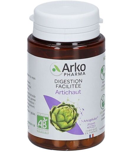 Complément alimentaire à utiliser dans le cadre d'une alimentation variée, équilibrée et d'un mode de vie sain.Arkogélules® BIO Artichaut, une formule d’origine biologique hautement concentrée en actifs ciblésL'Artichaut contribue au confort digestif et favorise la digestion.Les Arkogélules® BIO Artichaut, vous apportent chaque jour :114 mg de polysaccharidesLes feuilles d'Artichaut sont traditionnellement utilisées en phytothérapie pour favoriser l'élimination des toxines et des graisses au niveau du foie, et sont plus largement conseillées pour faciliter la digestion.L'Artichaut est une plante originaire du bassin méditerranéen. Elle appartient à la grande famille des Astéracées qui compte des espèces aussi variées que la marguerite, le pissenlit, la laitue ou l'échinacée.IngrédientsPoudre (Totum intégral) et extrait de feuille d’Artichaut* BIO (Cynara scolymus) – Epaississant : gomme d’Acacia BIO – Fibres de Pomme BIO (Malus domestica) – Poudre de fruit de Sarrasin BIO (Fagopyrum esculentum).GÉLULE 100% VÉGÉTALE (dérivé de cellulose).Données nutritionnelles Pour 2 gélulesPoudre de feuille d'Artichaut350 mgExtrait de feuille d'Artichaut160 mgConcentration en polyphénols13 mgConseils d'utilisationsVoie orale. À partir de 12 ans.Prendre 2 gélules en une seule prise le matin au moment du repas avec un grand verre d’eau.Précautions d'emploiNon recommandé pendant la grossesse et l’allaitement en l’absence de données suffisantes.Ne pas dépasser la dose journalière recommandée.Un complément alimentaire ne doit pas se substituer à une alimentation variée et équilibrée et à un mode de vie sain.Ne pas laisser à la portée des jeunes enfants.À conserver à l’abri de la lumière, de la chaleur et de l’humidité.Poids net40 gélulesFabricantArkopharmaBP 2806511 CARROS Cedex ...