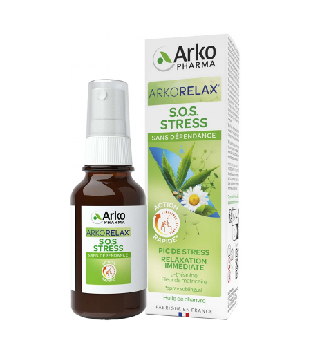 ARKORELAX S.O.S. STRESS est votre solution express pour vous aider en cas de pics de stress occasionnels (réunion, prise de parole en public, examen…). Propriétés et bienfaitsSon spray sublingual permet une action flash grâce à une libération et une absorption rapide d’actifs d’origine végétale ciblant le stress aigu : Les feuilles de thé vert, source de L-théanine, aident à se détendre en rééquilibrant la balance des neurotransmetteurs du stress (GABA et glutamate). Elles augmentent l'adaptation du corps dans les situations stressantes et extrêmes, favorisent la concentration et la mémoire.La fleur de matricaire favorise la relaxation et bénéficie d’un effet calmant sur le système nerveux. L’huile de graine de chanvre est reconnue pour son apport équilibré en acides nutritionnels, notamment en acides gras essentiels.Facile et pratique à utiliser, ARKORELAX® S.O.S. STRESS est une aide précieuse et nomade à emporter partout avec soi pour vous aider à lutter rapidement contre les montées de stress. Goût abricot. Ce produit n’entraîne aucune dépendance ni somnolence. Vegan. Sans gluten. ...
