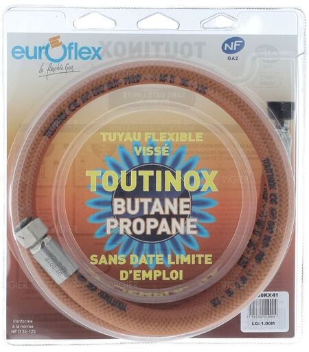 Tuyau gaz butane/propane 1m durée de vie illimité Longueur 1m Raccord à visser Tuyau flexible TOUTINOX Conforme à la norme NF D 36-125 Notice d'utilisation fournie ...