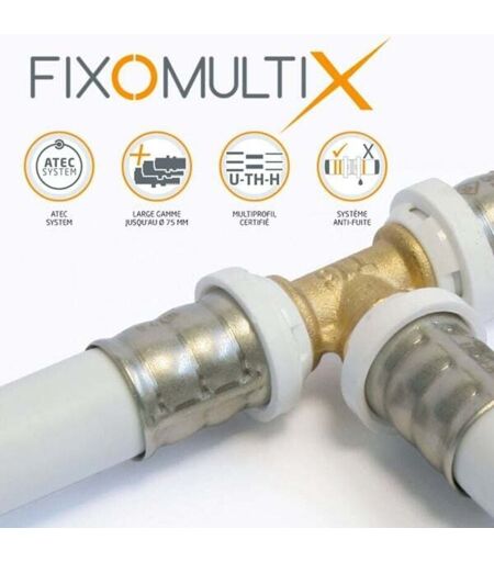 Présentation Raccord multicouche FIXOMULTIX pour chauffage et/ou de distribution d’eau chaude/froide : chauffage, PCBT, sanitaire. Bague de fixation en polyéthylène. Douille en inox de haute résistance garantissent un sertissage de qualité. Joints toriques en EPDM conformes à la norme EN 681-1. Équipé d’un système anti-fuite pour identifier toutes anomalies de sertissage lors de la mise en oeuvre. Résistance et fiabilité : Manchon à sertir en acier inoxydable. NF - Ce raccord est COMPATIBLE avec les profils TH-H ...