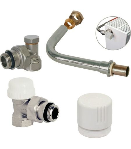 Présentation Pack complet permettant de raccorder votre radiateur par l'arrière avec du tube PER 2 cannes avec raccords PER à sertir diamètre 12 2 raccords bicône Mâle 15/21 (pour robinet et coude de réglage) 1 corps thermostatique 1 robinet manuel et 1 coude de réglage ...