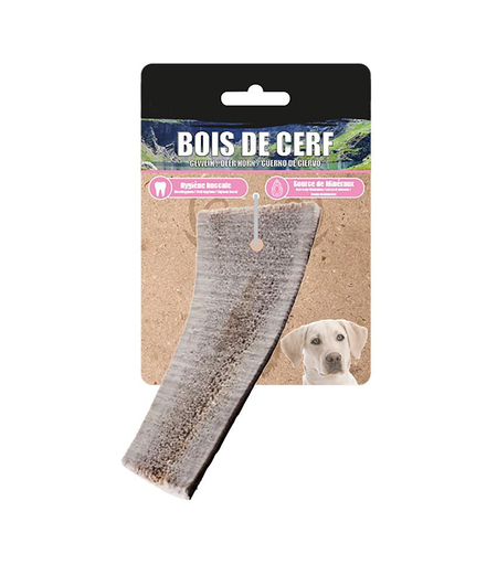 Vous voulez joindre l’utile à l’agréable en offrant une friandise à votre chien ? Le bois de cerf est ce qu’il vous faut ! Wouapy propose des demi-bois de cerf. Ceux-ci sont récoltés après la mue naturelle des cervidés. Ce sont des produits complètement sains pour votre animal, et qui n’ont aucun impact sur la nature. Très solides, ils jouent un rôle important sur le système bucco-dentaire. Ce type de friandise assouvit en effet le besoin de mastication instinctif de votre compagnon à 4 pattes. La dureté du bois de cerf renforce sa mâchoire et évite l’installation du tartre. De plus, grâce à sa robustesse, cette friandise naturelle ne va pas se fendre ou devenir friable, votre chien ne risque donc pas de se blesser avec. Le bois existe en trois tailles différentes, à choisir en fonction du gabarit de votre animal. Avec les nutriments et les minéraux qu’il contient, c’est un excellent complément alimentaire, à associer aux repas quotidiens de votre chien, et à accompagner d’eau fraîche à volonté. Pour une friandise naturelle et saine pour les dents de votre chien, ce demi-bois de cerf de Wouapy est parfait ! ...