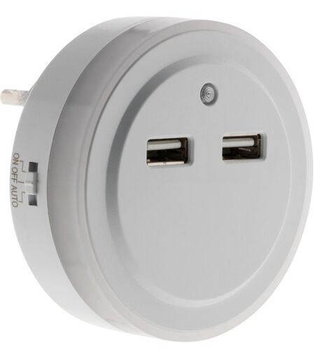 Veilleuse LED automatique avec 2 ports USB - Otio Cette veilleuse LED automatique est dotée de 2 ports USB qui vous permettent de recharger tous vos appareils multimédias (tablette, smartphone, enceinte bluetooth) en toute simplicité. Grâce à sa technologie LED, cette veilleuse vous assure une faible consommation d'énergie et s'active ou se désactive simplement à l'aide de son mode Auto/On et Off. Très facile à installer, il vous suffit de la brancher sur une prise de courant. Caractéristiques: Alimentation : 230V - 50Hz Puissance LED consommée : 0,5W Sélecteur Auto/On/Off 2 ports USB : 2x1A CLASS II IP20. ...