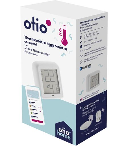 Description générale Entrez dans l'univers OtioHome et expérimentez la maison connectée ! Grâce à son application mobile unique et à sa gamme de produits connectés complète, OtioHome vous permet de piloter tous les objets de votre domicile par télécommande, smartphone ou assistant vocal. Ce thermomètre et hygromètre intelligent vous permet de contrôler en toute sérénité la température et l'humidité de votre maison, tout en visualisant en temps réel l'historique des 7 derniers jours. Spécifications techniques Modèle : thermomètre hygromètre connecté Technologie : Bluetooth smart (Low Energy) Portée : environ 30 m Plage d'hygrométrie : 20% à 95% RH (±5%) Plage de température : de -9°C à +50°C (±1°C) Alimentation : 2 piles AAA (non fournies) Compatible avec Google Home et Amazon Alexa Compatibilité et accessoires Compatible avec les assistants vocaux Google Home et Amazon Alexa Peut être associé à la passerelle connectée OtioHome (référence 751170) Application mobile pour le contrôle et ...