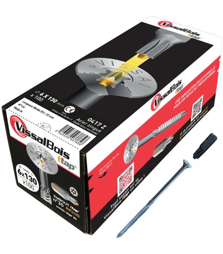 Caractéristiques : * 100 vis bois TTAP * Diamètre : 6mm * Longueur : 130mm * Type de tête : fraisée crantée * Empreinte de la tête : Torx TTAP * Embout Torx TTAP compatible : TX30 * Type de filetage : asymétrique partiel * Matériau : acier zingué Spécificités : * Empreinte Torx TTAP permettant de verrouiller parfaitement l'embout * Crans sous-tête permettant l'auto-fraisage * Moletage améliorant le serrage des pièces * Filetage asymétrique offrant une haute résistance à l'arrachement * Pointe anti-fendage évitant l'éclatement du bois ...