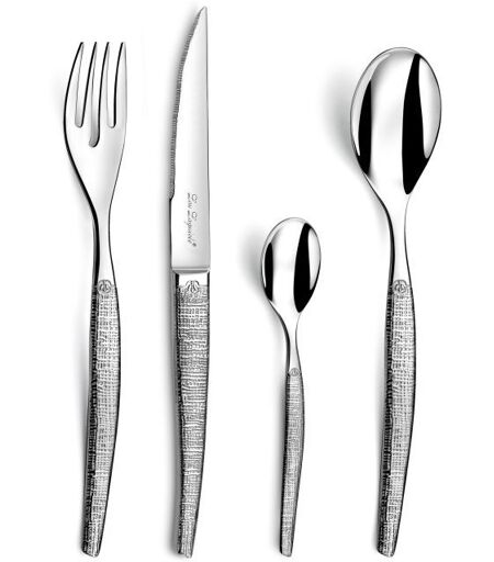 Ensemble de 24 couverts de la gamme Jet Textil par Lou Laguiole avec couteaux steaks à bout pointu. Couverts en acier 18/0 avec finition brillante et une gravure textile. Le Jet est une gamme Lou Laguiole® au design contemporain, souligné par un poinçon d'abeille stylisé. Le Jet se remet sur le devant de la scène avec le Jet Textil et son décor travaillé et inspiré de la "haute couture". Lou Laguiole® signe un design exclusif et traditionnel. Pour concevoir cette authentique gamme de couteaux Laguiole, nous mobilisons tout notre savoir-faire coutelier. Lou Laguiole® est une marque déposée et distribuée exclusivement par Amefa en France et dans le monde. Dimensions : Fourchette : 20.7 cm ; Cuillère table : 20.7 cm ; Cuillère café : 14 cm ; Couteau steak : 22.5 cm ...