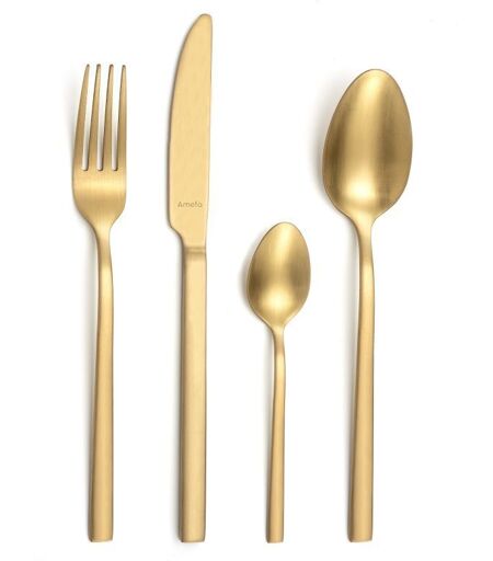 Ensemble de 16 couverts de la gamme Square. Acier Inox et finition teintée Champagne. Par ses formes rectilignes et ses pièces massives, la collection Square affirme sa présence. Conçu en acier teinté, le Square se décline en trois teintes lumineuses : Noir, Cuivre ou Champagne et confère une ambiance scandinave et chic à votre table. Fort de près de 90 années d'expérience dans les arts de la table, les couverts du groupe Amefa se définissent par l'exigence de leur dessin et le soin apporté à leur fabrication. Amefa vise l'excellence en matière de qualité, de design et de prix. ...