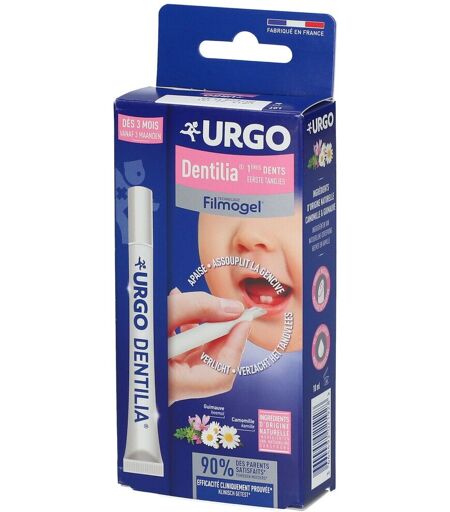 URGO Dentilia® est la première et unique solution Filmogel triple action qui soulage les nourissons lors de leurs premières dents.Conçu à partir d’ingrédients d’origine naturelle (camomille et guimauve), connus pour leur action apaisante et assouplissante sur les gencives. URGO Dentilia, réduit les pleurs des bébés, les aide à mieux dormir et réduit leur salivation. Action cliniquement prouvée.Son embout massant aide à réduire le gonflement et son gel muco-adhésif une action plus longue durée.IndicationsContre les troubles de la poussée dentaire, URGO Dentilia® associe à la fois des ingrédients d’origine naturelle et une formule innovante pour apaiser localement les gencives.Conseils d'utilisationSe laver les mains et bien agiter le tube avant toute utilisation.Vérifier que l’enfant soit bien éveillé pour éviter une fausse route.Retirer le bouchon, appuyer légèrement sur le tube afin d’obtenir l’équivalent d’une gouttelette.Mettre l’enfant en position assise ou verticale avant d’appliquer le produit puis masser délicatement la gencive à l’aide de l’embout applicateur pendant 10 à 15 secondes. Une fois le produit appliqué, URGO Dentilia n’est pas dangereux en cas d’ingestion par le nourrisson.Appliquer de préférence après le repas et avant que l’enfant ne se couche pour favoriser la formation du film.Pour assurer une bonne hygiène du produit, l’embout applicateur peut être rincé à l’eau claire et froide, la tête en bas. Bien refermer le tube avec le bouchon en vissant au maximum, après chaque utilisation. Conservez le produit tête en haut. Pour un apaisement optimal, le produit peut être mis au frais.PosologieMaximum 6 applications par jour. La poussée dentaire dure entre 5 et 8 jours. Un tube contient environ 70 applications.Précautions d’emploiNe pas administrer le produit sur l’enfant en position couchée, ni pendant son sommeil ou avant un repas.Ne pas laisser jouer l’enfant avec le produit et le bouchon ou mâchouiller l’embout applicateur. Tenir hors de portée et de la vue des enfants. Application sous surveillance d’un adulte.Ne pas allonger l’enfant immédiatement après l’application du produit.Ne pas utiliser en cas d’allergie à l’un des composants.Ne pas appliquer dans les oreilles ou le nez. En cas d’application accidentelle dans les oreilles ou le nez, rincer au sérum physiologique ou à l’eau tiède.Eviter tout contact avec les yeux. En cas de contact avec les yeux, rincer immédiatement à l’eau.En cas d’ingestion accidentelle d’une quantité supérieure à la dose recommandée, faire boire l’enfant.Ne pas stocker plus de trois mois à plus de 30 °C.ConservationAprès ouverture du tube, le produit se conserve à température ambiante ou au réfrigérateur.Principaux actifsA base d’ingrédients d’origine naturelle : Guimauve et Camomille.CompositionAQUA ; GLYCERIN ; CARRAGEENAN ; CELLULOSE GUM ; CROSCARMELLOSE SODIUM ; SODIUM BENZOATE ; SORBITOL ; ANTHEMIS NOBILIS FLOWER EXTRACT; ALTHAEA OFFICINALIS ROOT EXTRACT ; POTASSIUM SORBATE ; CITRIC ACID;... ...