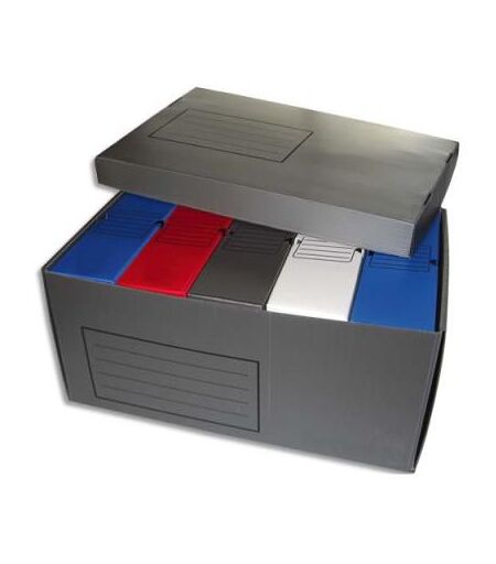 Boîte à archives Lot de 5 Boîtes archives et 1 conteneur En polypropylène alvéolaire gris pour le conteneur couleur pour les boîtes archive Indexation possible.– Boîtes archives dos 10 cm coloris assortis : 2 Bleu 2 Gris 1 Blanc.Dimensions : 34 x 245 cm.– Conteneur couvercle amovible.Dimensions : 56 x 35 x 26 cm Ensemble facile à monter livré à plat. ...