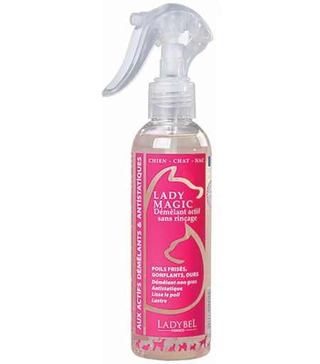 Lady magic par Ladybel : 200 ml.Conditionneur démêlant pour chats et chiens, aux protéines de riz biologique. Spray de 200 ml. Lady magic par Ladybel. Conditionneur démêlant aux protéines de riz biologique. Non gras, ses principes actifs procurent efficacité pour le démêlage et le brushing. Comment redonner rapidement tout son volume au poil de votre animal ? A l'aide de notre spray, cela sera un jeu d'enfant de coiffer votre compagnon ! Pour un résultat optimal, vous pouvez le combiner avec la Mouss' Coiff pour le brushing volumisant, mais aussi du Ring Parade pour un résultat ultra professionnel, ou avec le Wooly Warrior pour l'entretien des fourrures plus difficiles ou feutrantes. Caractéristiques et avantages : Aux protéines de riz biologique, Démêlant, Aide au brushing, Donne du volume à la fourrure, Lustreur naturel non huileux, Lisse le poil, Donne de la brillance au poil, Convient à toutes races et types de poil, Spray de 200 ml. ...