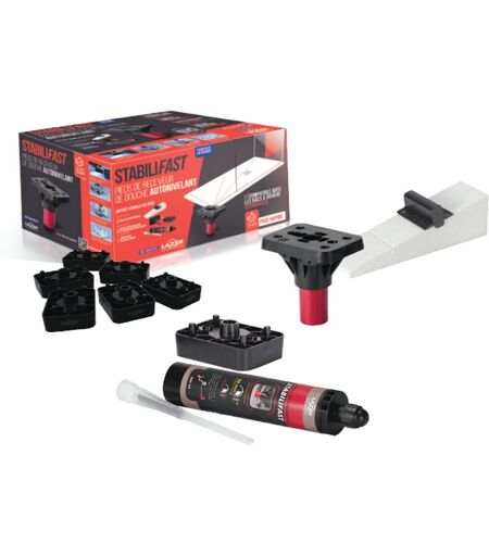 lot de 6 plots stabilifast avec rehausse Pieds de receveur de douche autonivelant. Pour tous types de bacs à douche. Tenue en compression : 1 tonne par pied. Hauteur réglable de 45 mm à 100 mm : jusqu'à 120 mm avec rehausses. Réglage automatique. Contient : 4 cales périphériques. 6 pieds auto nivelant et rehausses empliables. 1 résine de scellement. ...