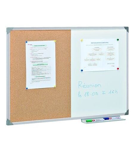 Double fonction: tableau blanc et panneau-liège pour écriture et affichage simultanés. Tableau blanc : métal laqué blanc. Ecriture effaçable à sec. Affichage magnétique.Panneau-liège : affichage par épingles.Encadrement aluminium anodisé. Coins enveloppants avec système de fixation intégré.Livrés avec auget et visserie pour fixation murale.Format : L 90 x H 60 cm. ...