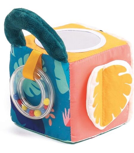 L'éveil n'a jamais été aussi drôle ! Adapté pour les enfants à partir de 3 mois, le cube d'éveil se prête à de nombreux jeux ! Tout doux et tout mou, il est composé d'une multitude de textures et d'activités sur le thème de la jungle. 7 activités pour jouer ! Pour aider bébé à agripper, retrouvez une poignée en tissu doux, facile à attraper par les petites mains. Découvrez également un anneau transparent avec des petites billes colorées, un hochet en forme de feuille (plastique doux à mordiller) et un anneau de dentition plus rigide. Ce dernier vous permet d'accrocher facilement le cube à la poussette, au siège-auto et au lit à barreaux. Sur les faces du cubes, bébé pourra s'admirer dans un petit miroir, caresser un joli tissu doux minky en vagues, gratter un tissu plissé, manipuler le papier bruissant de la feuille et découvrir le rigolo flamant rose. Ce jouet sensoriel est parfaitement adapté pour faciliter la prise en main et stimule les sens de bébé. Il développe la dextérité et la coordination des mouvements de l'enfant. Le cube d'éveil deviendra rapidement un compagnon fidèle à la maison et pendant les déplacements de la famille. ...