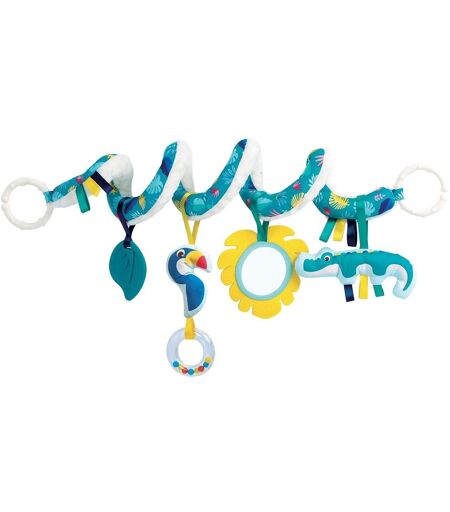 L'ornement idéal du cosy et des arches de poussette ! Cette jolie spirale au toucher doux et moelleux attire la curiosité de bébé. Adaptable à tous supports, elle s'enroule autour des barreaux du lit de l'arche de la poussette ou du siège auto et du cosy. Avec ses fixations en anneaux durs, les jouets ne pourront pas se perdre en chemin ! Sa décoration végétale est contemporaine et mixte. Les 4 activités amovibles aux couleurs vives éveillent les sens de bébé. Retrouvez : 1 hochet toucan au papier bruissant, avec son anneau transparent et ses petites billes multicolores, 1 anneau de dentition, 1 grelot dans le croco, 1 feuille en feutrine avec un miroir. Les jouets suspendus encouragent bébé à les atteindre, à tirer et à serrer. Les multiples textures captent également son attention. Ce jeu offre aux petits le développement naturel de la dextérité, de la coordination des gestes et l'éveil du champ visuel. Cet incontournable peut être emmené partout pour distraire les enfants en toutes circonstances. En voiture ou en poussette, il amusera bébé dans tous les déplacements de la famille. ...