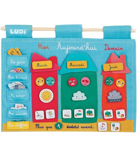 Le Panneau en tissu "Le temps qui passe" aide les petits à se repérer dans le temps grâce aux différents éléments amovibles. Les enfants peuvent suivre le cours de la semaine en notant le jour d?hier, celui d?aujourd?hui et celui de demain. Ils peuvent également préciser leur humeur, la météo et enfin toutes les activités réalisées et programmées jour après jour. Dimensions : 38 x 30 x 1 cm Âge : Dès 3 ans Matière : Coton et feutrine Modèle : Le temps qui passe Lavable à l'aide d'un chiffon humide Comprend : 7 jours de la semaine, 7 chiffres (de 1 à 7), 11 climats (le vent, la pluie, l?orage, la neige, le ciel nuageux, le soleil), 21 activités (l?école, la cantine, le sport, la musique, la maison, la fête, les courses, la piscine, le coloriage, etc.) et enfin 11 humeurs (joie, amoureux, colère, tristesse, malade et peur) ...