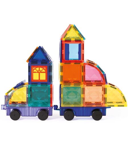 Des constructions roulantes et lumineuses ! À vos marques, prêts... construisez ! Avec la valisette Véhicules Magnétiques LUDI, les enfants dès 3 ans s'inventent un monde de véhicules extraordinaires à créer, démonter et reconstruire à l'infini. Un jeu de construction ludique, intelligent et haut en couleurs pour stimuler la créativité et découvrir les formes en 3D ! Construis, invente, transforme ! Ce coffret généreux contient 63 pièces aimantées aux formes variées, parfaites pour réaliser des constructions en 2D sur une surface plane ou en 3D pour un effet waouh garanti ! Grâce à deux bases de véhicules à roulettes, les enfants peuvent assembler leurs créations pour former des trains, camions, voitures, fusées et bien plus encore. Chaque assemblage devient un nouveau défi pour l'imagination ! Les pièces transparentes et colorées créent un superbe effet kaléidoscope lorsqu'elles sont exposées à la lumière. Ce jeu de lumière renforce l'attrait visuel et stimule la perception spatiale. Empiler, imbriquer, connecter... tout devient possible ! Un jeu d'éveil pour petits bâtisseurs curieux En jouant avec les formes géométriques aimantées, les enfants développent naturellement leur coordination oeil-main, leur logique et leur compréhension des volumes. C'est aussi une excellente manière d'aborder les premiers principes d'assemblage et de construction tout en s'amusant. Solide, accessible et évolutif, ce jeu peut s'utiliser seul ou à plusieurs, pour partager des moments de création en famille ou entre copains. Un format pratique à emporter partout L'ensemble est livré dans une valisette rigide de rangement, idéale pour ne rien perdre et emporter le jeu partout avec soi : en vacances, chez les grands-parents ou simplement d'une pièce à l'autre ! Les pièces sont légères, durables et conçues pour résister à l'enthousiasme des jeunes constructeurs. Caractéristiques : Adapté aux enfants à partir de 3 ans Contient 63 pièces magnétiques dont 15 carrés / 8 quarts de cercles / 10 rectangles / 20 triangles / 4 fenêtres / 2 bases de véhicules Dimensions des carrés : 7,5x7,5 cm Composition : 100% Méthacrylate de méthyle-acrylonitrile-butadiène-styrène (MABS) Lavable avec un chiffon humide. ...