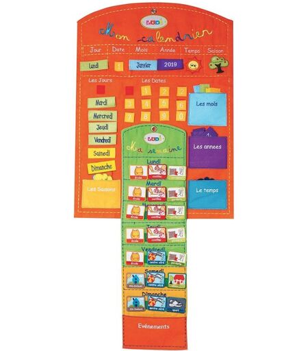 Calendrier en tissu brodé d'une grande qualité aide l'enfant à se repérer quotidiennement dans le temps jour, mois, saisons, année, heure.Les éléments amovibles , les 12 mois, les 7 jours, les 4 saisons, 6 années, 12 chiffres, 5 le climat. Dimensions : 56 x 42 cm. Livré dans une pochette. Lavable à la main. Hauteur : 52 cm. ...