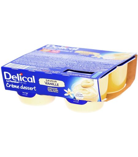 Il est important d'avoir une alimentation variée et équilibrée et un mode de vie sain.Delical Crème Dessert La Floridine® HP HC vanilleCrème dessert HP HC La Floridine®. Crème dessert lactée, hyperprotidique, hypercalorique, aromatisée.Denrée alimentaire destinée à des fins médicales spéciales. À utiliser en cas de : Dénutrition protéino-énergétique (personnes âgées, cancer, maladie d’Alzheimer), toute pathologie cachectisante ou catabolisante, anorexie ou inappétence, fonte musculaire, Maladies neuro-dégénératives, stomatologie, cancers de la sphère ORL, Troubles de la déglutition, déglutition douloureuse, Problèmes de mastication, de dentition. Prête à l’emploi, stérilisée UHT 180 kcal, 10 g de protéines pour 100g Sans gluten Niveau de texture selon échelle IDDSI: 3 Index glycémique : 29 IngrédientsLait entier (32%), eau, protéines de lait, sucre, huile de colza, crème (lait), maltodextrine, amidon, modifié de maïs, arômes, correcteur d'acidité (E524), colorant (beta carotène), vitamines (C, E, A, B5, PP, D3, B2, K1, B6, B1, B12, B9, B8), épaississant (E407), émulsifiant (E471).Données nutritionnelles Valeurs nutritionnelles Valeur énergétique kJ 946 / 943 kcal 226 / 225 Matières grasses g 10 AET % 40 dont acides gras saturés g 3,3 Glucides g 21 / 201 AET % 37 / 361 dont sucres g 15 / 16,51 dont lactose g 2 / 1,51 Fibres alimentaires g%g – % AET 0,8 / 2,51 – 1 / 21 Protéines g 12,5 AET % 22 Sel g 0,16 / 0,171 Vitamines A µg ER 175 D µg 1,8 E mg α-TE 4 K µg 12,5 C mg 25 B1/ Thiamine mg 0,29 / 0,25 B2/Riboflavine mg 0,61 / 0,64 B3/Niacine mg NE 4,5 B6 mg 0,4 / 0,36 B9/Acide folique µg 56,3 / 50 B12 µg 0,5 / 0,31 B8/Biotine µg 12,5 B5/Acide pantothénique mg 2,3 / 2,4 Sels Minéraux Sodium mg 62,5 / 68,8 Potassium mg 96 / 225 Chlorure mg 62,5 / 68,8 Calcium mg 288 Phosphore mg 180 / 213 Magnésium mg 12,5 / 31,31 Fer mg 0,11 / 1,4 Zinc mg 1,5 Cuivre mg 25 / 146 Sélénium mg 7,5 / 7,3 Chrome mg 12,5 OSMOLARITÉ mOsm/L – Conseils d'utilisation1 à 4 pots de 125g par jour (ou 1 à 2 pots de 200g) à adapter en fonction des besoins du patient ou à la prescription médicale. A prendre en remplacement du dessert habituel ou en collation. Servir frais de préférence en plaçant les produits au réfrigérateur. A utiliser sous contrôle médical. Aliment incomplet, ne peut être utilisé comme seule source d’alimentation. Il convient de s’assurer que la texture est adaptée aux capacités de déglutition du patient. Ne convient pas aux enfants de moins de 3 ans. La prescription est à adapter pour les patients atteints d’insuffisance rénale et/ou hépatique ou pour un usage pédiatrique. Précautions d'emploiConserver dans un endroit frais et sec.Poids net4x125 gFabricantBS NutritionRue de l'Industrie, 201400 NivellesBelgique ...