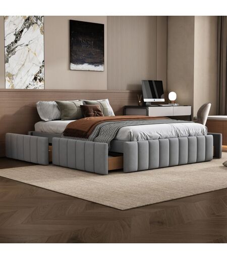 Lit capitonné 140 x 200 cm cadre de lit lit simple lit double lit design avec sommier à lattes (sans matelas) Ce lit plat de style minimaliste moderne est fabriqué à partir d'une sélection de matériaux en velours et MDF de haute qualité pour garantir durabilité et confort ainsi qu'une sensation agréable. de qualité. Le look est simple mais élégant et s'adapte à une variété de styles modernes. Quatre tiroirs facilitent l'organisation et le rangement de vos affaires et les gardent bien rangés. Ce lit crée une atmosphère chaleureuse et confortable à la maison et fait de chaque repos un plaisir. Description + Dimensions Matériau du lit : Velours Dimensions : 140 x 200 cm Couleur : Gris Nombre de colis : 2 Assemblage nécessaire : Oui Origine : Vietnam Dimension produit : 218 x 149 x 35 cm Dimensions du colis : Veuillez noter le cahier des charges Dimensions intérieures du lit : 140 x 200 cm Hauteur totale : 35 cm Capacité de poids : 182 kg Nombre de lattes : 10 pièces Épaisseur du matelas ...