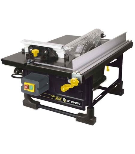 Description générale Cette scie sur table 800W Steiner est idéale pour la découpe de panneaux, le délignage et le débit de pièces de bois, de bois composite, de stratifiés et de matériaux dérivés. Compacte et légère, elle pèse seulement 10 kg , ce qui la rend simple, mobile et efficace pour vos chantiers ou votre atelier. Grâce à sa lame inclinable , vous pourrez réaliser des coupes précises de 45° à 90°. Elle est livrée avec un guide parallèle , un guide d’angle et un bâton poussoir . Spécifications techniques Alimentation : 230V~50Hz Capacité de coupe à 90° / 45° : 43 / 22 mm Caractéristiques de l'outil de coupe : Ø200 x 16 x 2.4 mm - 24 dents Dimension de la table de travail : 505 x 373 mm Inclinaison de la table : 45° à gauche Interrupteur de sécurité à manque de tension : Oui Poids : 10.8 kg Puissance : 800 W Vitesse moteur à vide : 2950 tr/min + produit : 4 patins en caoutchouc pour limiter les vibrations, connecteur d’extraction 30 mm Accessoires : 1 guide parallèle, 1 guide ...