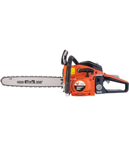 Description générale Cette tronçonneuse thermique allie puissance et légèreté, offrant un confort d'utilisation optimal grâce à sa griffe d’abattage métallique, sa commande de starter semi-automatique et sa pompe d’amorçage facilitant le démarrage. Sa gâchette à double commande de sécurité et son bouclier frein de chaîne assurent une protection accrue lors de vos travaux d’élagage, d’abattage de petite et moyenne section et de débitage de bois de chauffage. Livrée avec un guide et une chaîne Oregon. Spécifications techniques Capacité du réservoir de carburant : 550 ml Capacité du réservoir d'huile : 260 ml Cylindrée moteur : 45cc Longueur du guide : 455 mm (18') Pas de chaîne : 8,255 mm (0,325') Poids : 5 kg Pompe d'amorçage : Oui Puissance : 1700 W Starter semi-automatique : Oui Type de carburant : Mélange essence sans plomb SP95 ou SP98 / huile moteur 2 temps 100% synthèse (ratio 2.5%) Type moteur : Moteur essence 2 temps monocylindre refroidi par air Type produit : Tronçonneuse ...