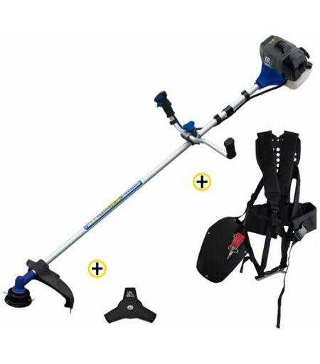 DESCRIPTION GÉNÉRALE Moteur 2 temps monocylindre de 42,7cc, lame 3 dents Ø255mm, tête de coupe 'tap and go' japonaise de haute qualité Ø420mm, bougie Champion. Cette débroussailleuse permet d'éclaircir facilement toutes les zones accidentées de votre jardin. Son guidon rotatif monobloc ergonomique et son harnais double épaule facilitent le travail et limitent la fatigue lors des longues opérations. SPÉCIFICATIONS TECHNIQUES Capacité de coupe bobine coupe bordure (mm)Ø420 mm Capacité de coupe lame débroussailleuse (mm)Ø255 mm Capacité du réservoir de carburant (ml)1200 ml Cylindrée moteur (cm³)42,7 cm³ Embrayage centrifuge de sécuritéOui Fixation rapide du guidon sans outilOui Poids7,5 kg Pompe d'amorçageOui Puissance (W)1200 W Type de carburant- Mélange essence sans plomb SP95 ou SP98 / huile moteur 2 temps 100% synthèse (ratio 2.5%) Type de démarragePar lanceur Type moteurThermique 2T Type produitThermique Vitesse moteur max (tr/min)9000 tr/min + infosBougie Champion Accessoires1 ...