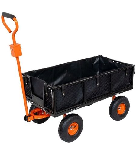 Ce chariot de jardin avec châssis en acier permet le transport aisé de vos charges lourdes et encombrantes jusqu’à 300Kg . Monté sur 4 roues à roulement à billes équipées de jantes en acier et de pneus gonflés , il pourra aisément être déplacé sur terrain accidenté. Doté de parois latérales rabattables et amovibles rapidement par clavettes, vous pourrez charger et décharger plus facilement votre chariot. Pratique grâce à sa poignée modulable en timon , vous pourrez vous en servir de remorque et ainsi le tracter à l’aide de votre tondeuse autoportée, votre quad ou votre micro tracteur. Très polyvalent grâce à sa bâche étanche amovible en polyester avec revêtement PVC , ce chariot de jardin deviendra rapidement indispensable pour l'entretien de vos extérieurs ou tout autre type de travaux. Capacité de charge max (kg) : 300kg Dimension : - La caisse (L x l x h) : 96x51x25cm - Le chariot monté (L x l x h) : 114x54x96cm Livré avec : Bâche imperméable amovible Matière : Châssis acier – ...