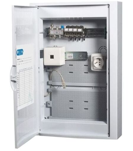 Coffret de communication pour le câblage de l'arrivée téléphonique , des antennes terrestes TNT/SAT , et d'un réseau internet composé de 4 connecteurs RJ45 CAT6 ( possibilité d'ajouter 4 connecteurs supplémentaires). Une prise de courant permet l'alimentation de la box. Un emplacement est réservé pour fixer la box dans le coffret. Fiche technique · Certification : CE · Composition - 1 coffret avec porte incluse et 2 plaques multiperforées - 1 rail DIN - 1 prise DTI - 1 répartiteur TV - une entrée / 4 sorties - 4 connecteurs RJ45 avec support pour fixation sur rail DIN - 4 cordons de brassage plat RJ45 - 1 prise électrique 230V - 1 bornier de terre - 1 bande auto-agrippante pour la fixation de la box · Couleur : Blanc · Dimension (mm) : 360 x 540 x 85 mm · Fonction - Connexion de l'arrivée de la ligne téléphonique - Connexion de l'ensemble de l'arrivée et des départs des antennes terrestes possibilité de répartir le signal internet/ TEL ou TV de la box sur une ou plusieurs prises RJ45 ...