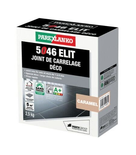 Description générale Le mortier joint carrelage PAREXLANKO 5046 Elit Caramel est idéal pour la réalisation des joints sur les sols et les murs extérieurs et intérieurs d'une finesse de 1 à 6 mm. Ce mortier à base de ciment amélioré est adapté à tous les types de planchers chauffants et offre une protection contre l'eau. Attention : ne pas appliquer ce produit pour des travaux concernant des piscines, saunas, hammams, et utiliser exclusivement des couleurs claires pour les réalisations extérieures. Spécifications techniques Quantité d'eau à utiliser : 2,4 à 2,7 L par sac de 20 kg Consommation : 0,02 à 0,6 kg/m² Coloris : caramel Composition : liants hydrauliques, charges minérales fines, adjuvants et pigments de couleurs Densité apparente de la poudre : 1 ± 0,1 pH : 12 ± 0,1 Poids : 2,5 kg Compatibilité et accessoires Compatible avec les revêtements en grès cérame, faïence, granit, terre cuite, etc. Adapté aux surfaces déformables : tous les planchers (rayonnant électrique ou eau basse ...