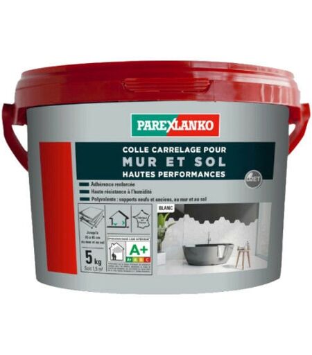 Présentation : La colle carrelage pour mur et sol hautes performances PAREXLANKO prête à l'emploi pour réaliser vos collages de carrelage sur votre sol et votre mur en intérieur. Dotée d'une excellente résistance à l'humidité, cette colle est parfaitement adaptée aux lieux soumis à l'humidité comme comme les salles de bains, la cuisine. De plus, ce produit multi-supports peut se coller sur du grès cérame, du grès émaillé, de la faïence neufs mais également en rénovation. Avantages : Adaptée aux lieux humides : excellente résistance à l'humidité Polyvalent : adapté aux supports neufs ou anciens, au mur et au sol Idéale pour les formats de carreaux moyens jusqu'à 45 x 45 cm pour la faïence au mur Caractéristiques : Consommation pour sol intérieur 45 x 45 cm : 6 kg/m² Consommation pour mur intérieur 45 x 45 cm : 5 kg/m² 30 min pour carreler 20 min pour ajuster 24 h à 5 jours pour réaliser les joints 48 h pour la remise en eau Poids : 5 kg Réf. 03369 Conditionnement : Une colle carrelage ...