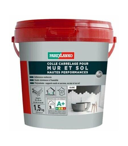 Présentation : La colle carrelage pour mur et sol hautes performances PAREXLANKO prête à l'emploi pour réaliser vos collages de carrelage sur votre sol et votre mur en intérieur. Dotée d'une excellente résistance à l'humidité, cette colle est parfaitement adaptée aux lieux soumis à l'humidité comme comme les salles de bains, la cuisine. De plus, ce produit multi-supports peut se coller sur du grès cérame, du grès émaillé, de la faïence neufs mais également en rénovation. Avantages : Adaptée aux lieux humides : excellente résistance à l'humidité Polyvalent : adapté aux supports neufs ou anciens, au mur et au sol Idéale pour les formats de carreaux moyens jusqu'à 45 x 45 cm pour la faïence au mur Caractéristiques : Coloris : blanc Consommation pour sol intérieur 45 x 45 cm : 6 kg/m² Consommation pour mur intérieur 45 x 45 cm : 5 kg/m² 30 min pour carreler 20 min pour ajuster 24 h à 5 jours pour réaliser les joirs 48 h pour la remise en eau Poids : 1,5 kg Réf. 03368 Conditionnement : Une ...
