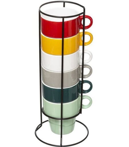 Lot 6 tasses capucino avec support metal empilables. Assortiment de 6 couleurs de tasses en céramiques: rouge, orange, jaune, vert, bleu et violet dimensions totale: hauteur 28cm x diamètre 13,5cm dimensions tasse: hauteur 9,5cm x diamètre 8,5cm. ...