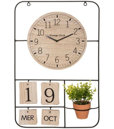Fonctionnalité et vintage chic se conjuguent avec l'horloge "Camille" Atmosphera. Horloge et calendrier Cette horloge ronde en bois est associée avec un calendrier perpétuel, sans oublier une petite plante artificielle pour ajouter une touche de verdure. Le tout est disposé dans un cadre métallique à l'esprit néo-industriel. Ne manquez plus un rendez-vous Fonctionnelle et silencieuse, l'horloge "Camille" affiche clairement les heures et les minutes grâce à son cadran traditionnel aux chiffres arabes et encoches pour les minutes. Les plantes artificielles Atmosphera sont ultra réalistes, parfaites pour donner de la fraîcheur à votre déco. Le petit plus déco Accrochez votre calendrier perpétuel au niveau du regard dans un lieu de passage, pour le mettre à jour facilement. ...