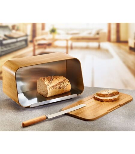 Très élégante cette boîte à pain s'intègre parfaitement dans toutes les cuisines ! Elle conserve efficacement la fraîcheur des pains et viennoiseries et sa porte en bambou sert astucieusement de planche à découper. Caractéristiques Matières : métal effet bambou et bambou Contenance : 10 L Belles dimensions : 34,5 x 16,5 x 19 cm Couteau non vendu ...