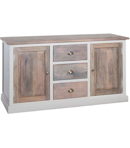 Authentique et raffiné, ce buffet apportera de la douceur à votre pièce. Grâce à ses trois tiroirs et ses deux portes vous pourrez ranger soigneusement votre vaisselle en toute discrétion. Son plateau quant à lui pourra accueillir vos objets de décoration préférés ou servir comme plan de travail. FICHE TECHNIQUE - Structure du buffet en MDF et bois de manguier. - Pratiques et esthétiques, ses trois tiroirs et ses deux portes vous offriront des rangements discrets pour ranger votre vaisselle ou vos objets personnels. CARACTERISTIQUES TECHNIQUES - Dimensions : L. 150 x l. 45 x H. 80 cm. - Poids : 70 kg. ...