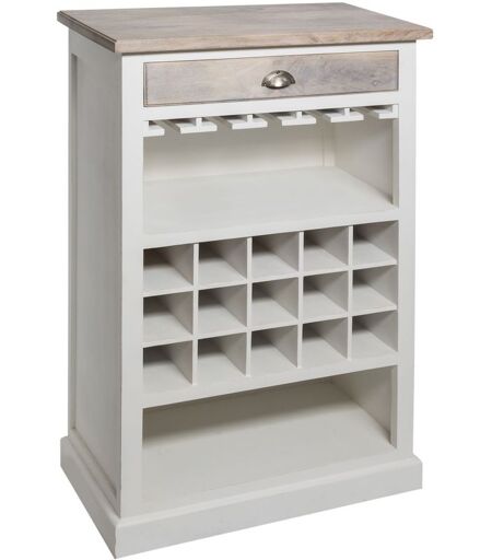 Elégante et raffinée, cette étagère aux nombreux rangements accueillera vos bouteilles dans ses casiers et vos objets personnels dans son tiroir et ses deux niches. Son design épuré et chaleureux apportera de la douceur à votre pièce. FICHE TECHNIQUE - Structure de l'étagère en bois d'acacia. - Plateau et tiroir en bois de manguier. - Finition de la structure en laque nitrocellulose. - Idéale pour le rangement de quatre bouteilles. CARACTERISTIQUES TECHNIQUES - Dimensions totales : L. 73 x l. 40 x H. 115 cm. - Dimensions du tiroir : L. 55,5 x l. 29 x H. 7 cm. - Hauteur de l'étagère : H. 22,3 cm. - Hauteur de la niche : H. 21 cm. - Poids : 42,4 kg. ...