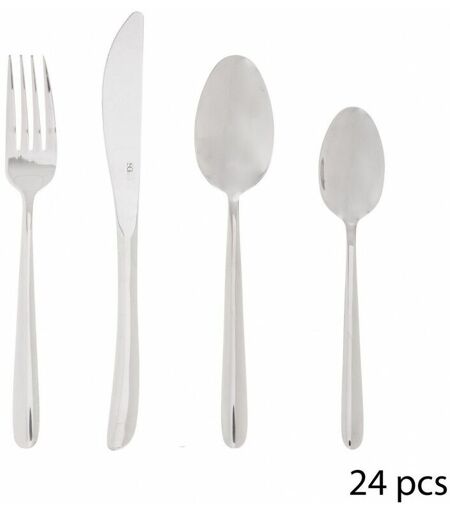 Ménagère en inox, 24 pièces, Orba. Les finitions de ces couverts feront toute la différence sur votre table. Cette ménagère en inox est composée de 6 fourchettes, 6 couteaux, 6 cuillères à soupe et 6 cuillères à café. Les couverts sont conçus pour le contact alimentaire, passent au lave-vaisselle et ne sont pas conçus pour une utilisation au four et au micro-ondes. Dimensions des couverts : Fourchette : L 19,6cm x l 2,7cm Epaisseur : 0,3mm. Couteau : L 23,3cm x l 2cm Epaisseur : 0,5mm. Cuillère à soupe : L 20cm x l 4cm Epaisseur : 0,3mm. Cuillère à café : L 17,2cm x l 3,3cm Epaisseur : 0,2mm. Finition du polissage : Machine Couleur : Argenté Longueur : 16.5 cm Largeur : 6.5 cm Hauteur : 27.5 cm . Couleur : Argenté. Matière: Inox. Hauteur : 27.5 cm. Longueur : 16.5 cm. Largeur : 6.5 cm ...