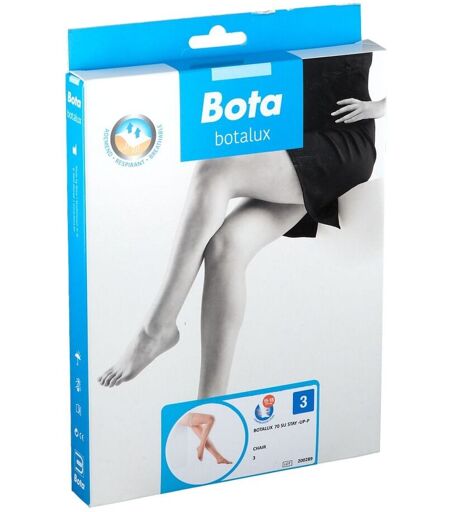 Botalux 70 Bas de contention 70 deniers (15 / 18 mm Hg). Restez debout "SU-P (sans les orteils) 8 mm Hg. Indications Jambes fatiguées ou lourdes en raison du travail ou pendant la grossesse. Composition 81% PA, 19% EL. Dimensions Taille : 3. Couleur : Chaise. ...