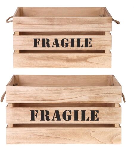 Ces 2 belles cagettes gigognes en bois brut vous séduiront à coup sûr ! Leur style authentique illustré du message ""Fragile"" apportera beaucoup de cachet dans votre intérieur tout en vous permettant de ranger avec facilité les affaires de la maison. GM : 54 x 37 x 28 cm PM : 48 x 31 x 26 cm ...