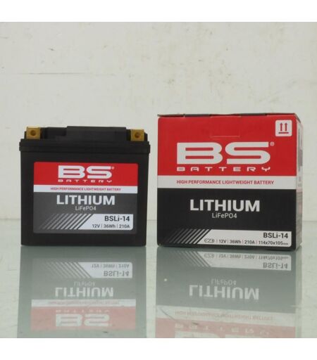 Batterie polymère BS Battery neuve haut de gamme au Lithium Ion référence BSLi-14 (HY110). Caractéristiques: - Longueur: 114mm - Largeur: 70mm - Hauteur: 105mm - Tension: 12V - Capacité: 3Ah - Puissance : 36Wh - CCA: 210A - Bornes + à droite La batterie BSLi-14 fait partie de la gamme LiFePO4. Conçue pour les conducteurs les plus exigeants, cette batterie 12,8V 3Ah (36Wh) offre des performances de démarrage maximales, une sécurité accrue et une durée de vie plus longue. Grâce à sa conception ultra-légère, cette batterie BSLi-14 permet une accélération plus rapide de tous les véhicules de sport motorisés. Utile, cette batterie est équipée d'un indicateur de tension permettant de vérifier l'état de charge à tout moment. Caractéristiques: - Prête à l'emploi - Jusqu'à 70% plus légère qu’une batterie plomb - Montage multi position : jusqu'à 180° - Durée de vie étendue : plus de 2000 cycles - ...