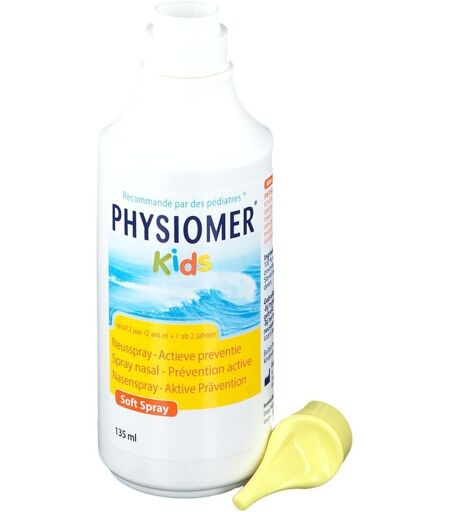 PHYSIOMER® Kids garde chaque jour le nez de votre enfant propre et le protège des rhumes!En cas d’écoulement nasal et de nez bouché, PHYSIOMER® Kids rétablit la respiration nasale et réduit l’intensité et la durée des symptômes au niveau du nez, tout en prévenant les complications O.R.L.Pourquoi choisir PHYSIOMER® ?Recommandé par les pédiatres**Efficacité prouvéeDiffusion en douceurUtilisation dans plusieurs positionsPourquoi choisir PHYSIOMER® Kids pour votre enfant ?Les jeunes enfants peuvent attraper jusqu’à 10 rhumes par an, car leur système immunitaire se construit au contact des virus. Aller à la crèche ou à l’école augmente les risques d’attraper un rhume.PHYSIOMER® Kids est utilisé pour l’hygiène quotidienne et aide à protéger votre enfant d’infections nasales répétées. Laver régulièrement le nez de votre enfant aide à éliminer les allergènes, la poussière, les polluants, les virus et les bactéries.En cas de problèmes au niveau du nez, PHYSIOMER® Kids soulage le nez bouché et l’écoulement nasal : il réduit la durée des symptômes et diminue également l’utilisation concomitante d’autres médicaments (liés aux infections des voies respiratoires supérieures et aux rhinites allergiques).Aidez chaque jour votre bébé à respirer librement avec PHYSIOMER® Kids.PHYSIOMER® Kids est adapté aux enfants grâce à sa brume douce. La taille du flacon est pratique lorsque les enfants se lavent le nez seuls.100 % eau de mer non diluée : grâce à un procédé de production spécifique, PHYSIOMER® conserve la richesse en minéraux de l'eau de mer.PHYSIOMER® a une efficacité cliniquement prouvée, supérieure à celle d’une simple solution saline***.Conditionnement ingénieux : le flacon PHYSIOMER® est unique grâce à un système de diffusion sans gaz propulseur qui permet un flux doux continu. Il est incassable et peut être utilisé dans toutes les directions pour un confort d’utilisation accru.* IQVIA Sell-out data 2020** Recommandation pour le lavage nasal en général*** In vitro dataTraitementPHYSIOMER® Kids est le meilleur partenaire de votre bébé pour réduire la congestion nasale causée par le rhume, la rhinite ou la rhinopharyngite. Découvrez les autres solutions PHYSIOMER® pour enfants.PréventionEn lavant et en hydratant quotidiennement les fosses nasales, PHYSIOMER® Kids aide à protéger contre le rhume et la rhinopharyngite.IndicationsEnfants dès 2 ansConseil d'utilisationAussi souvent que nécessaire.Traitement des symptômes au niveau du nez en cas de rhume (nez qui coule et nez bouché) ou grippe : 4 à 6 fois par jour, pulvérisez 1 à 2 secondes dans chaque narine.Utilisation quotidienne, hygiène et prévention : 1 à 2 fois par jour, pulvérisez 1 à 2 secondes dans chaque narine.Avant utilisation: vérifiez le bon fonctionnement du spray nasal pour le nez.La présence d’un adulte est recommandée en cas d’utilisation par l’enfant.Penchez la tête sur un côtéInsérez doucement l’embout dans la narine supérieure et exercez une pression ferme pendant 1-2 secondes. Laissez la... ...