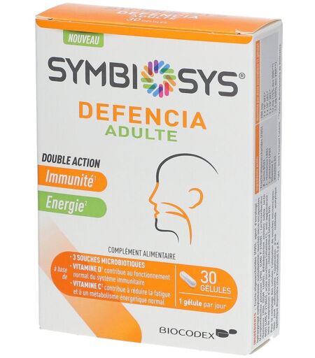Complément alimentaire à utiliser dans le cadre d’une alimentation variée, équilibrée et d’un mode de vie sain.SYMBIOSYS Defencia Adulte est un complément alimentaire destiné à l’adulte. Il contient les souches microbiotiques Bifidobacterium animalis subsp. lactis BS01, Lacticaseibacillus rhamnosus LR04, Lactiplantibacillus plantarum LP02, ainsi que de la vitamine D1 qui contribue au fonctionnement normal du système immunitaire et de la vitamine C2 qui contribue à réduire la fatigue et à un métabolisme énergique normal.IngrédientsFructo-oligosaccharides (FOS); agent d'enrobage : hydroxypropyl methylcellulose ; maltodextrine; souches micro-encapsulées Lactiplantibacillus plantarum LP02 (LMGP-21020) ; Lacticaseibacillus rhamnosus LR04 (DSM 16605); Bifidobacterium animalis subsp. lactis BS01 (LMG P-21384)) ; acide ascorbique (vitamine C); anti-agglomérant : sels de magnésium d'acides gras ; cholécalciférol (vitamine D3).Valeurs nutritionnelles Pour 1 géluleFOS200 mgB. lactis BS012x109 UFC*L. rhamnosus LR042x109 UFC*L. plantarum LP022x109 UFC*Vitamine C12 mg (15% des VNR**)Vitamine D32.5 μg (50% des VNR**)*Unités Formant des Colonies**Valeurs Nutritionnelles de RéférencesConseils d'utilisationPrendre 1 gélule de SYMBIOSYS DEFENCIA Adulte chaque matin pendant 1 mois. A avaler avec un verre d'eau. Ne pas dépasser la dose journalière recommandée.Renouveler pendant la période hivernale. Un complément alimentaire ne doit pas se substituer à un mode de vie sain et à une alimentation équilibrée et variée.Précautions d'emploiConserver dans un endroit sec et à une température ne dépassant pas 25°C. Tenir hors de portée des enfants. Par précaution, l’utilisation de ce produit n’est pas recommandée pendant la grossesse ou l’allaitement. Pour plus d’informations, parlez-en à votre médecin.Poids net30 gélulesAdresse du FabricantDPO Biocodex7 Avenue Gallieni94250 Gentilly, France ...