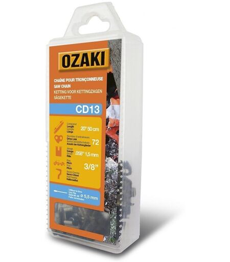 Chaîne de tronçonneuse OZAKI CD13 sous coque semi carrée: .3/8 .058 (1,5mm) 72 entraîneurs ( E72 ) La chaine OZAKI® CD13 sous coque semi carrée: .3/8 .058 (1,5mm) 72 entraîneurs ( E72 ) bénéficie d'un traitement thermique particulier sur chaque gouge. Une lubrification spécifique réalisée sur chaque maillon lors de l'assemblage en usine, réduit l'allongement de celle-ci. Elle offre ainsi à l'utilisateur une qualité de coupe et de confort efficace et durable. Détails : Jauge (inch):.058'' Jauge (mm):.058'' (1,5 mm) Nombre d'entraineurs:72 Pas:3/8'' LES CHAINES OZAKI® sont testées, approuvées et certifiées ISO 9001 : 2000 Pour quelle Tronçonneuse convient la Chaine OZAKI CD13 ? Marque : ACTIVE - AL-KO - ALPINA - BLITZ - CASTEL - CASTOR - CUB CADET - DOLMAR - DYNAMAC - ECHO - EFCO - HUSQVARNA - IRCEM - JONSERED - MAKITA - McCULLOCH - McCULLOCH (ITALY) - NAUTAC - OLEO-MAC / OLYMPIC - PARTNER - PARTNER (ITALY) - POULAN - SHINDAIWA / SDK / ISEKI - SOLO - TANAKA - TOPSO - VAP - ZENOAH Modele : ACTIVE: MT51, MT56, MT62AL-KO: 251, 261, 460, 480ALPINA: 600i, P.700, P.800, P650, P660, P680, P750, PRO55, PRO56, PROF-65, PROF-66, PROF-700, PROF-800, 600BLITZ: B50, B500, B501S, B502, B504, B52, B55, B60, B600, B64, B701, B702, B80, B800, B802, B804CASTEL: CS60CASTOR: CP-55, CP-56, CP-65, CP-66, CP-700, CP-800, CP600, CP600I, CP650, CP750CUB CADET: CC4256, CS5720DOLMAR: CA, ES1800, KMS4, PS43, PS52, PS540, PS6000i, PS6400, PS7300, PS7310, PS7900, PS7910, PS4600, PS5000, PS5105, PS6000iH, PS6800i, PS6800iH, PS9000, PS9010, 109, 110, 111, 112, 113, 114, 115, 116, 117, 119, 120Si, 120, 122, 123, 133, 143, 144, 152, 153, 186, 219, 1231, 12051DYNAMAC: 55 DELUXEECHO: CS590, CS620SX, CS680, CS800, CS5000, CS5501, CS6700, CS6701, CS8000, 6702, 6800, 8001EFCO: 170, 171, 180, 181HUSQVARNA: 33, 36, 40, 40P, 41, 42, 44, 45, 50, 51, 55, 57, 133, 133SE, 133SG, 136, 140, 141, 154, 234, 238, 240, 240S, 240SE, 242, 243, 246, 248, 254, 257, 261, 262, 262XP, 262XPG, 340, 340S, 340SG, 346, 357, 357XP, 359, 359E-TECH, 360, 362, 362XP, 440, 444, 455, 555, 560XP, P44, EL16, 1200, EL1400, EL1500, EL1600, JUNGLE 3120, 61, 65, 66, 70, 77, 160, 162, 181, 185, 260, 266, 268, 272, 281, 285, 288, 288XP LITE, 298, 365, 371, 372XP, 372, 380, 385XP, 390, 394, 395, 395XP, 480, 562XP, 570, 575, 3120XP, 575XP, 576XP, 1100, 2100, 2101, 3120, 365X-TORQ, 570IIIRCEM: 12000F, 1700FJONSERED: CS2159, CS2163, CS2165, CS2171, CS2186, 60, 61, 62, 66, 70, 75, 77, 80, 81, 90, 110, 111, 490, 520SP, 525, 535, 590, 601, 621, 625, 630 SUPER, 630, 630 West Coast, 670 CHAMP, 670, 751, 801, 820, 820/830* (*WITH 9MM STUD), 830, 910E, 920, 920/930* (*WITH 9MM STUD), 930, 941, 2050, 2051, 2055, 2063, 2065, 2071, 2077, 2083, 2094, 2095, 2159, 2163, 2165, 2172, 2186, 2188MAKITA: DCS6800i, DCS6400, DCS7300, DCS7900, DCS460, DCS520i, DCS6000i, DCS6401, DCS7301, DCS ...