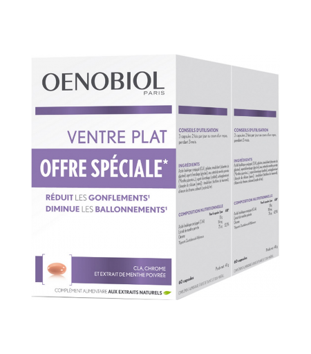Les années aidant à la ménopause font que la plupart des femmes à 45 ans et plus ont des rondeurs nées de grossesses ou liées à l'élasticité de la peau dont elles voudront bien se débarrasser.L'expertise Oenobiol, grâce à sa formule composée d'Acide Linoléique Conjugué(CLA), de chrome, d'extraits de grain de lin et de menthe, fait du ventre de la femme ménopausée, un rêve en éliminant les gonflements et les ballonnements indésirables.Prendre 3 capsules 2 fois par jour au cours d'un repas, pendant 3 mois.Boite de 2x60 capsules à renouveler. Résultat visible dès trois mois.Testé scientifiquement. ...