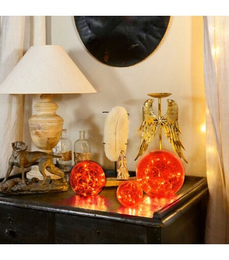Apportez une ambiance chaleureuse et raffinée à votre intérieur avec cette lampe décorative à poser composée de boules en verre brun. Chaque lampe comporte trois boules de diamètres différents (20 cm, 15 cm et 10 cm) équipées de 60 LED blanc chaud au total, diffusant une lumière douce et chaleureuse. Idéale pour décorer une table, une étagère ou un meuble, cette lampe apporte style et convivialité à votre décoration intérieure tout en créant un coin cosy. Le câble argent transparent se fond discrètement dans le décor, mettant en valeur uniquement la lumière des LED et la transparence chaleureuse du verre brun. La lumière fixe diffuse une atmosphère apaisante, parfaite pour vos soirées, vos repas ou simplement pour ajouter une touche lumineuse et élégante à votre intérieur. Fonctionnant avec une alimentation 3,2V, cette lampe est conçue pour un usage intérieur uniquement et est vendue à l’unité, prête à l’emploi. Caractéristiques techniques : Diamètres des boules : 20 cm / 15 cm / 10 ...