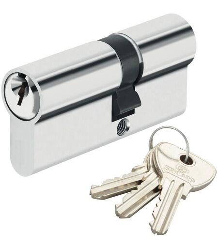 Cylindre de sécurité pour porte de 30 + 50 mm livré avec 3 clefs Détails du cylindre Bricard Alpha : - Modèle : Alpha 17121 - Longueur du cylindre : 30 + 50 mm - 5 goupilles de fermeture - Canon avec 2 entrées de clé (intérieur/extérieur) - Cylindre à profil européen - Matière, finition : Laiton nickelé - 3 Clés crantées - 23000 clés différentes par profil - Protection renforcée : résistance au crochetage par des contre-pistons multiformes - Cylindre anti corrosion : Pour utilisation porte intérieur ou extérieur Ce que nous aimons : Ce cylindre de sécurité conviendra parfaitement à une porte intérieur de bureau, de logement ou d'extérieur. Il possède une protection renforcée anti crochetage avec des contre-pistons multiformes Ce cylindre de porte double entrée en laiton nickelé est livré avec 3 clés crantées. ...